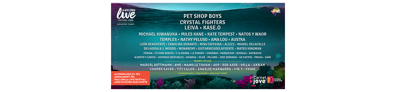 IMPORTANT: el descompte és vàlid en un únic abonament per titular del Carnet Jove. Per poder accedir al Mallorca Live Festival amb l’abonament Carnet Jove serà indispensable presentar el DNI (o document d’identitat equivalent) i el Carnet Jove vigent, juntament amb l’abonament per accedir al recinte. En el cas de no presentar el Carnet Jove i DNI o document equivalent, NO es podrà accedir al Festival. Compra el teu abonament amb descompte abans que s’esgotin! Trobaràs tota la informació del festival a: http://mallorcalivefestival.com