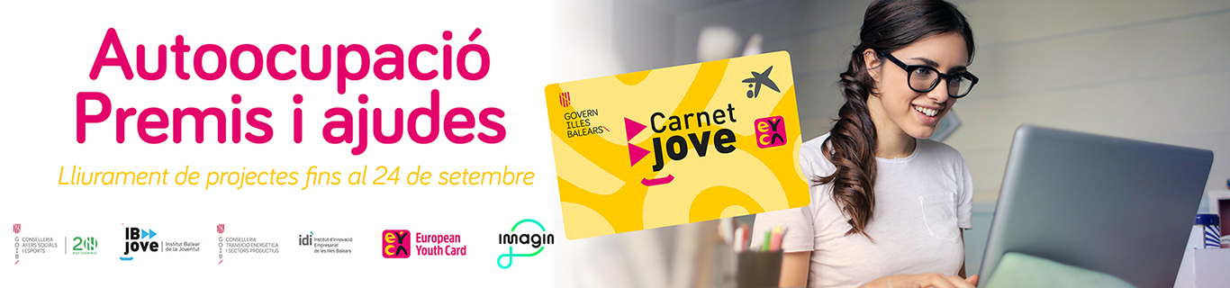 El Institut Balear de la Joventut, ha convocado a los Premios Carnet Jove para Proyectos de autoempleo y ayudas para iniciar la actividad de estos proyectos con el fin de contribuir a la mejora de la empleabilidad de los jóvenes y que dirige a los titulares del Carnet Jove de les Illes Balears de entre 18 y 30 años que quieran impulsar proyectos de negocio desde el autoempleo, y también a agrupaciones de jóvenes con el mismo objetivo.